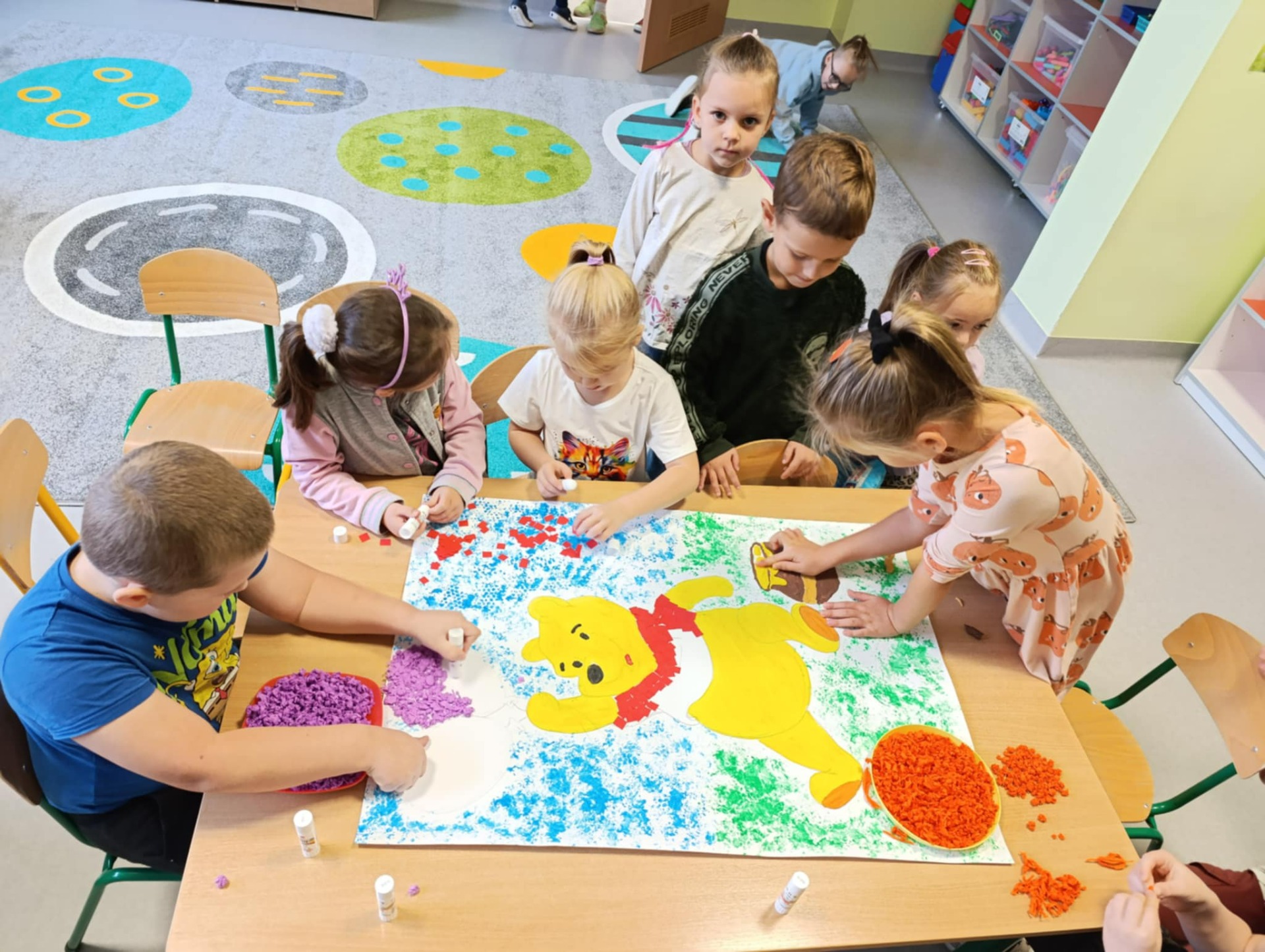 Wspólnymi siłami stworzyliśmy ogromną postać przyjacielskiego misia. Podczas pracy małe rączki intensywnie ćwiczyły – dzieci malowały, odciskały, wyklejały, wydzierały i zwijały kuleczki z bibuły. Była to doskonała terapia ręki, a efekt końcowy przerósł nasze oczekiwania. Każdy przedszkolak z dumą prezentował wspólne dzieło.