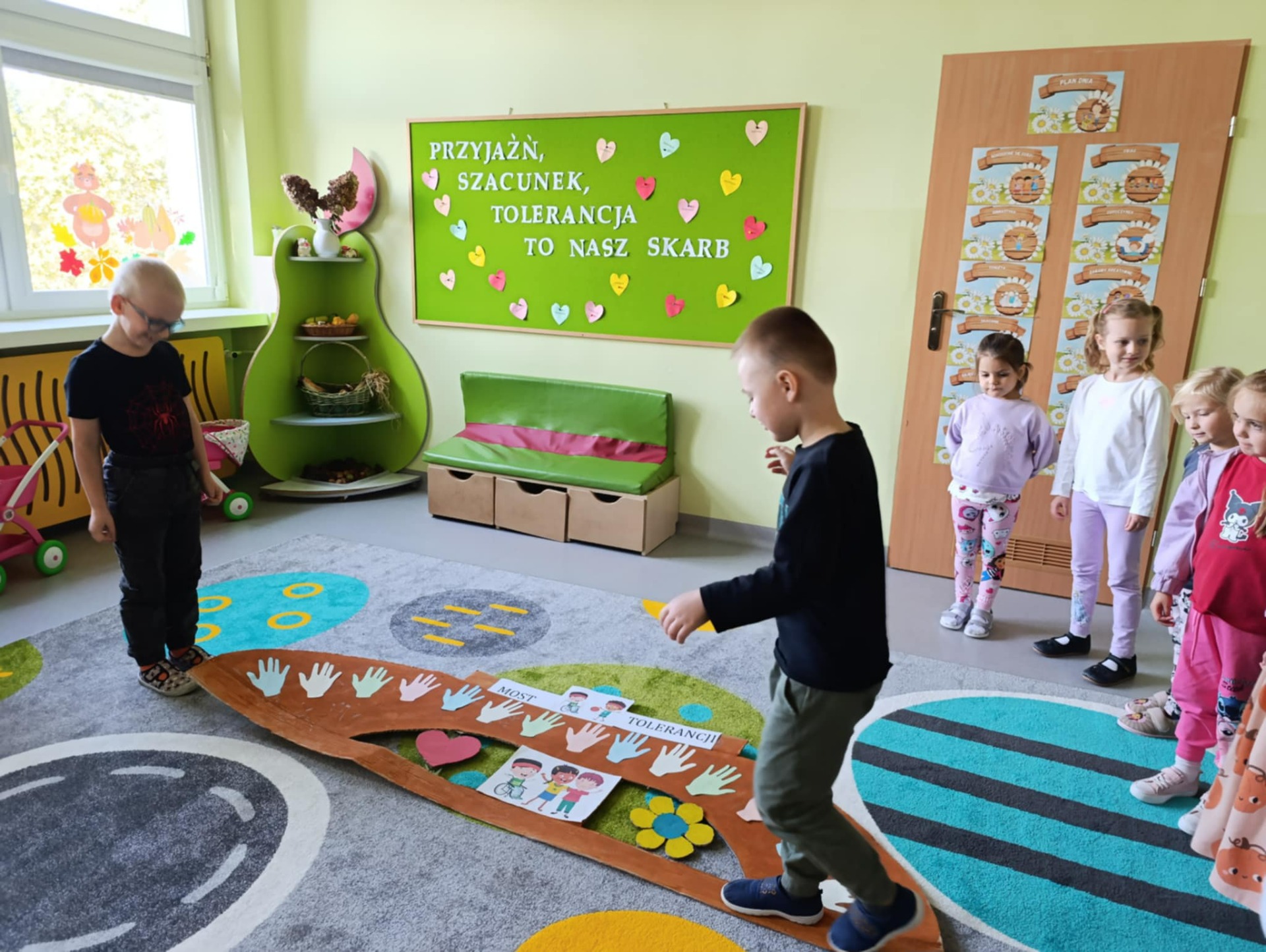 Do naszego Kuferka Wartości trafił kolejny symbol – dłoń, oznaczająca tolerancję. Symbolem współpracy i jedności stał się także Most Tolerancji, który wspólnie zbudowaliśmy i ozdobiliśmy kolorowymi rączkami dzieci. Każda rączka to inna osobowość, inny charakter, ale razem tworzą piękną, różnorodną całość – tak jak nasza grupa, w której uczymy się, że różnice nas nie dzielą, lecz wzbogacają.