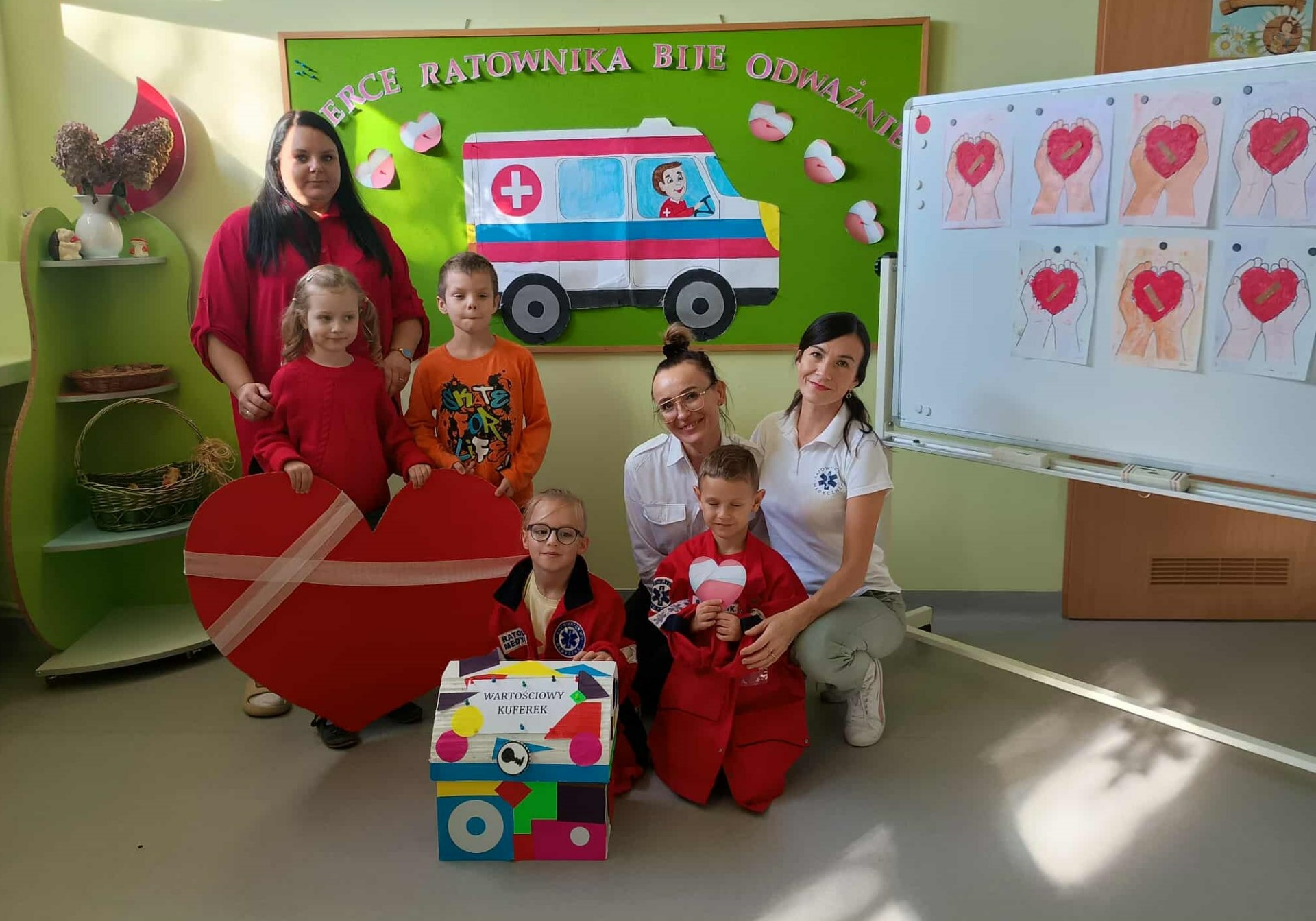 Spotkanie stało się także okazją do realizacji elementów innowacji pedagogicznej „Kuferek wartości”. Tym razem dzieci poznały wartość bezinteresownej pomocy. Wspólnie stworzyły symbol – serce z opatrunkiem, które trafiło do kuferka jako znak, że pomaganie innym leczy nie tylko rany, ale i serca. W sali zawisło hasło: „Serce ratownika bije odważnie”, które towarzyszyło wszystkim działaniom tego dnia. Podczas rozmowy dzieci zastanawiały się, co to znaczy być ratownikiem – doszły do pięknego wniosku, że każdy        z nas może być takim ratownikiem, gdy pomaga innym  z dobroci  i bez oczekiwania niczego w zamian.