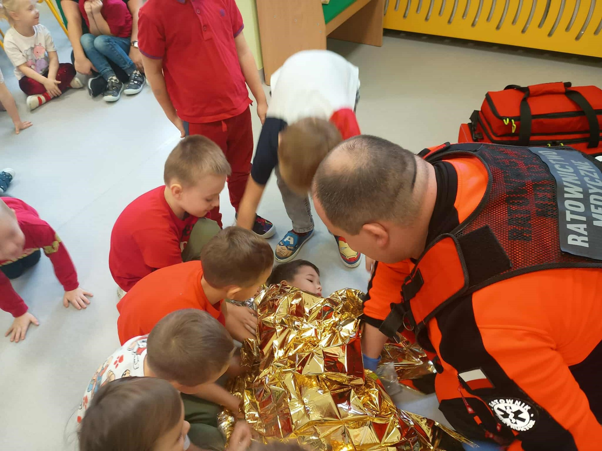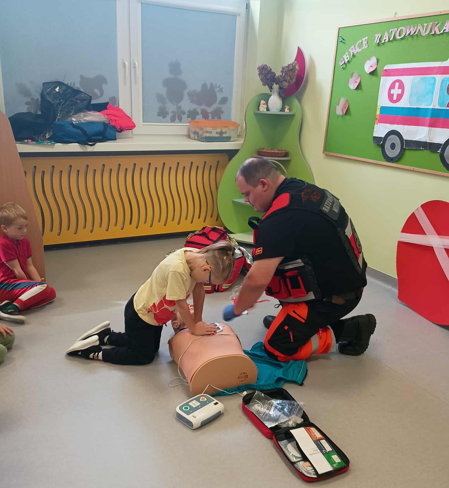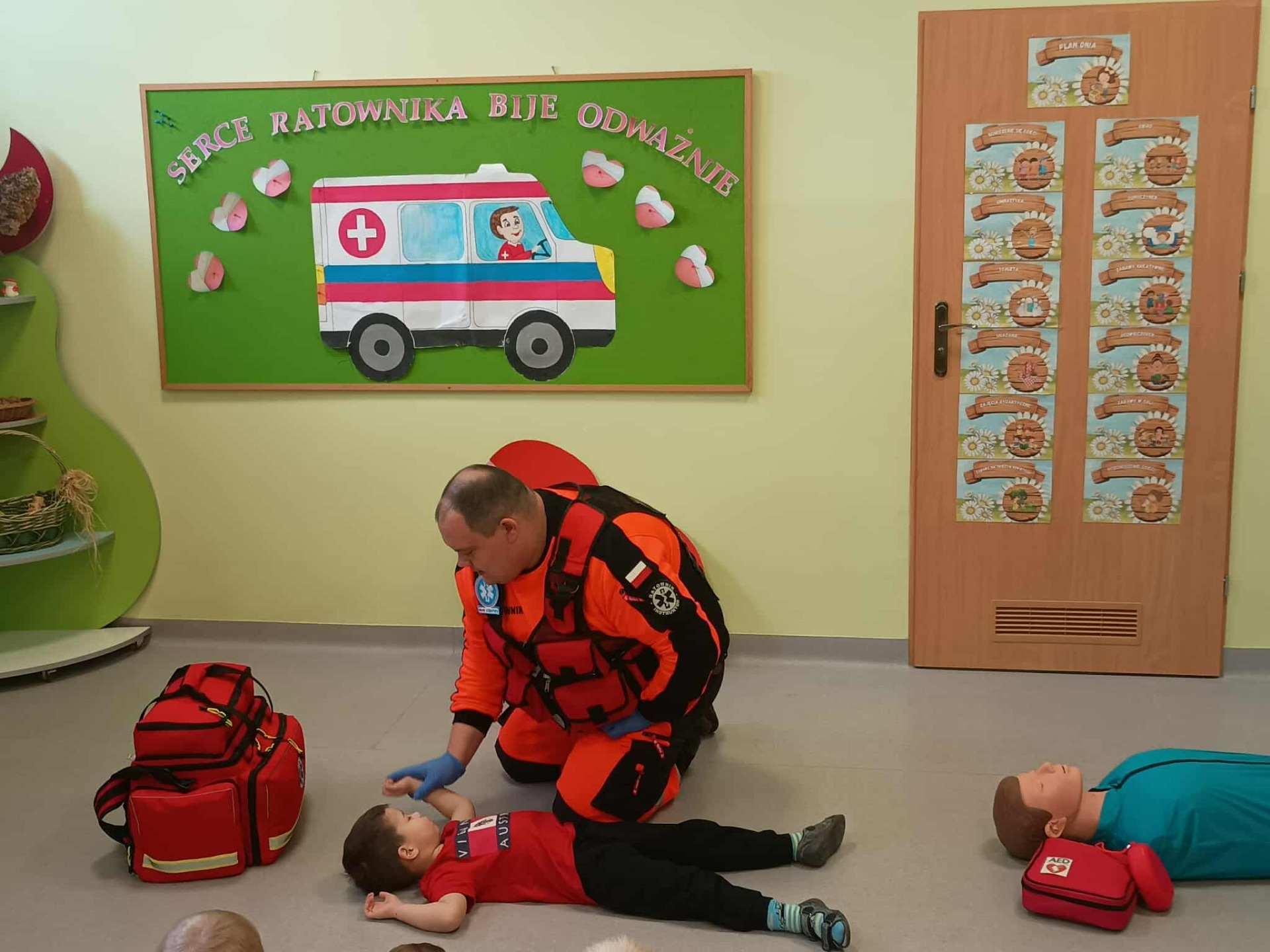 Podczas zajęć przedszkolaki poznały numery alarmowe, uczyły się, jak wezwać pomoc, a także jak zachować się, gdy ktoś potrzebuje wsparcia. Pod czujnym okiem Pana Krzysztofa dzieci ćwiczyły na fantomach, poznając podstawy udzielania pierwszej pomocy. Z zaangażowaniem bandażowały i usztywniały kończyny swoich kolegów                                      i koleżanek, ucząc się, że pomoc może być jednocześnie nauką i zabawą.