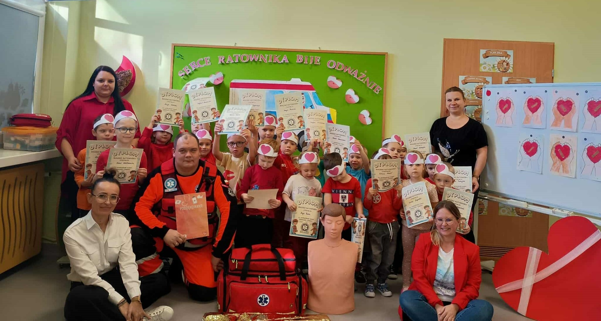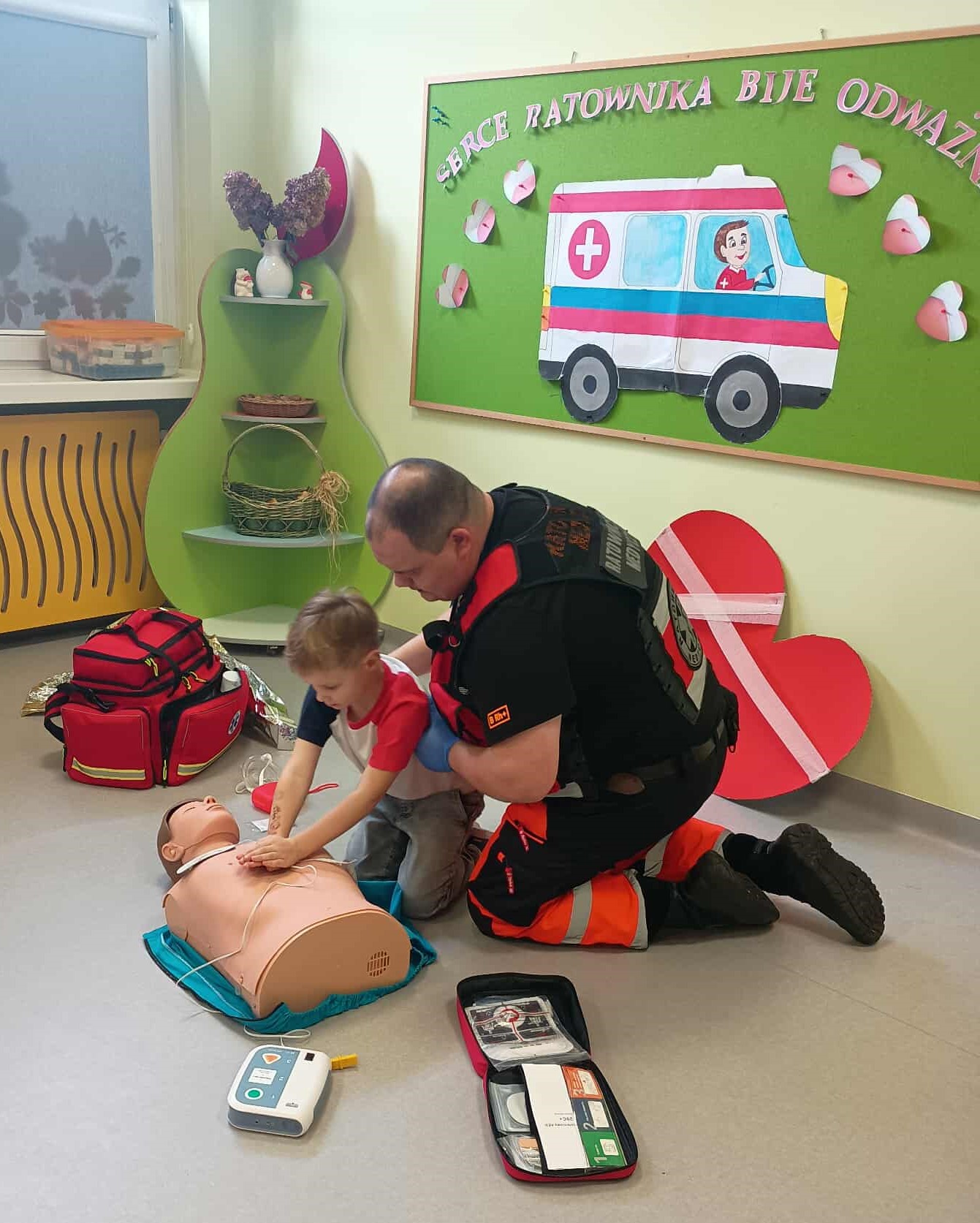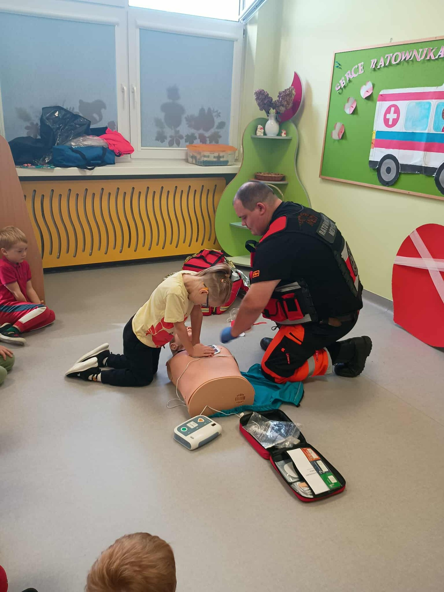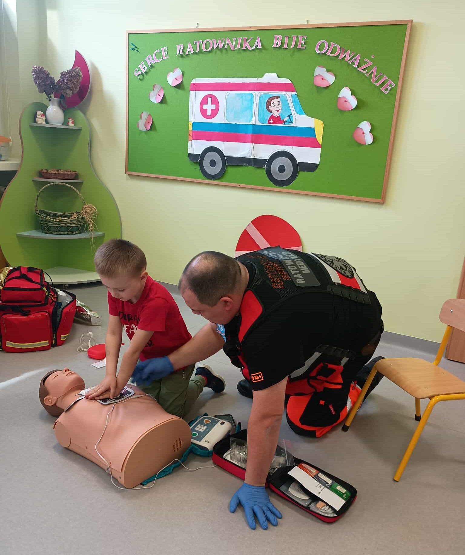 Podczas zajęć przedszkolaki poznały numery alarmowe, uczyły się, jak wezwać pomoc, a także jak zachować się, gdy ktoś potrzebuje wsparcia. Pod czujnym okiem Pana Krzysztofa dzieci ćwiczyły na fantomach, poznając podstawy udzielania pierwszej pomocy. Z zaangażowaniem bandażowały i usztywniały kończyny swoich kolegów                                      i koleżanek, ucząc się, że pomoc może być jednocześnie nauką i zabawą.