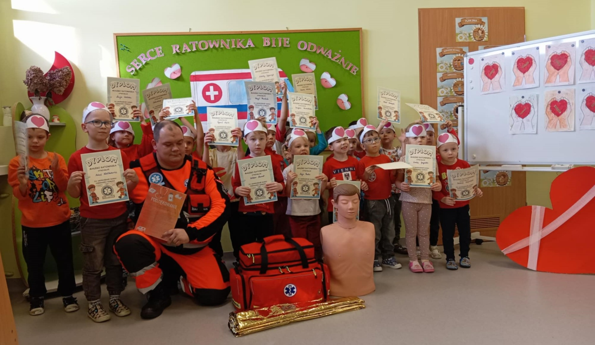 Pan Krzysztof w niezwykle ciekawy i przystępny sposób opowiedział przedszkolakom o swojej pracy oraz o tym, jak ważne jest szybkie reagowanie w razie wypadku.               Dzieci dowiedziały się, czym zajmuje się ratownik medyczny, jak wygląda jego codzienna praca i jak ogromne znaczenie ma odwaga oraz chęć niesienia pomocy innym.