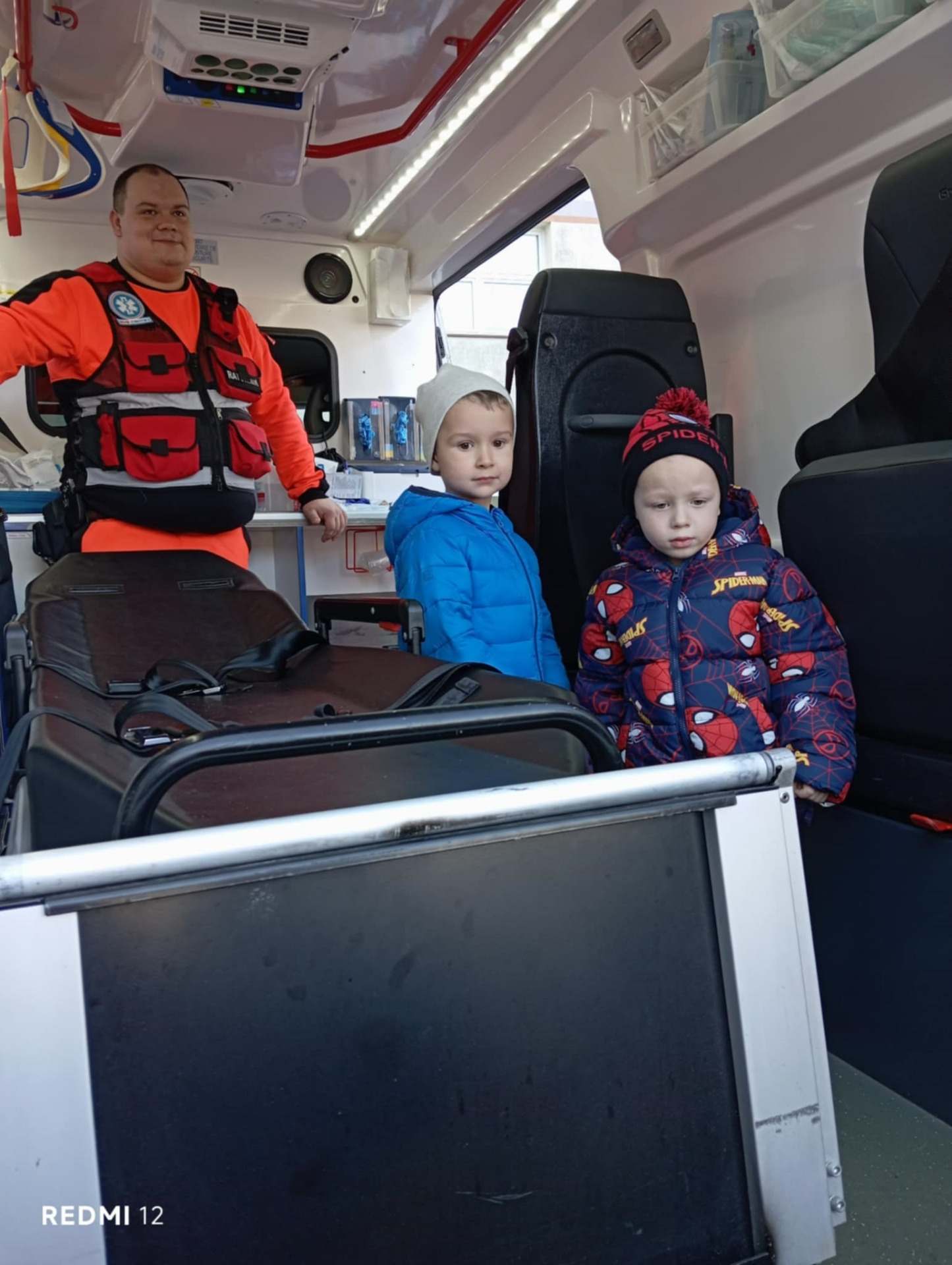 Ogromną atrakcją była wizyta przy prawdziwym ambulansie. Ratownik zaprezentował wnętrze karetki, sprzęt medyczny – defibrylator, torbę medyczną i nosze – oraz pozwolił dzieciom z bliska zobaczyć, jak wygląda praca zespołu ratowniczego. Nie zabrakło również emocji – każdy przedszkolak mógł usiąść za kierownicą karetki i uruchomić sygnał dźwiękowy!