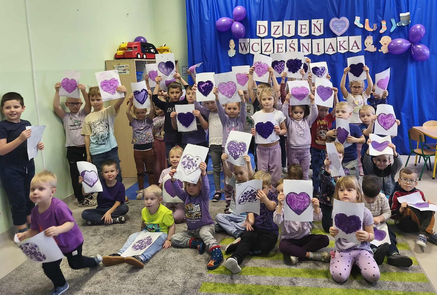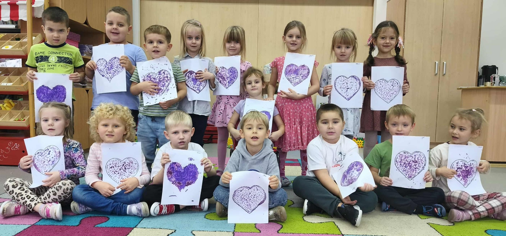 17 listopada 2025 roku nasze przedszkole obchodziło „Światowy Dzień Wcześniaka”. Z tej okazji dzieci przyszły ubrane na fioletowo a naszą placówkę ozdabiały fioletowe akcenty i balony. Dzieci wykonały piękne fioletowe serca, jako symbol wsparcia dla przedwcześnie urodzonych niemowląt.