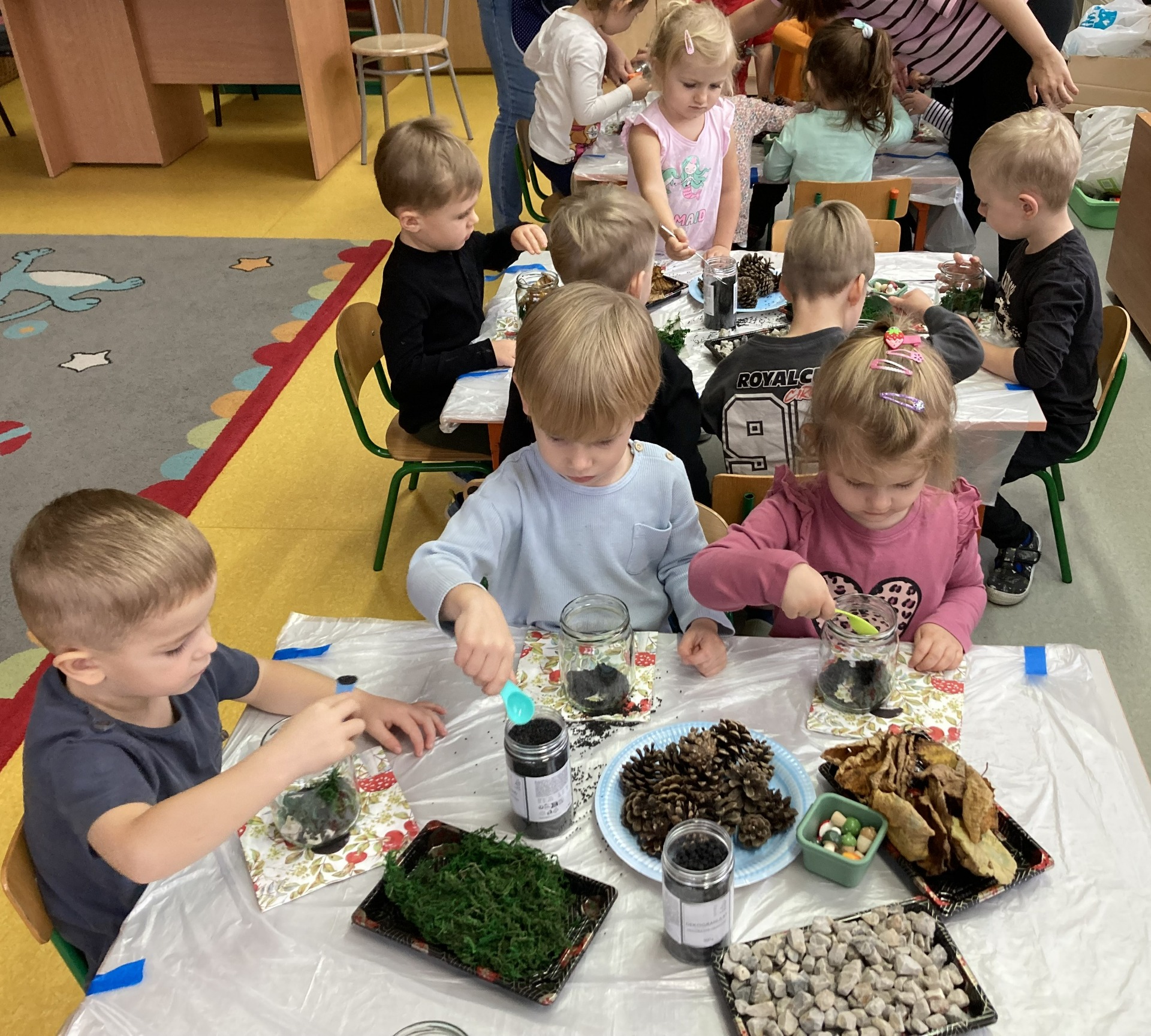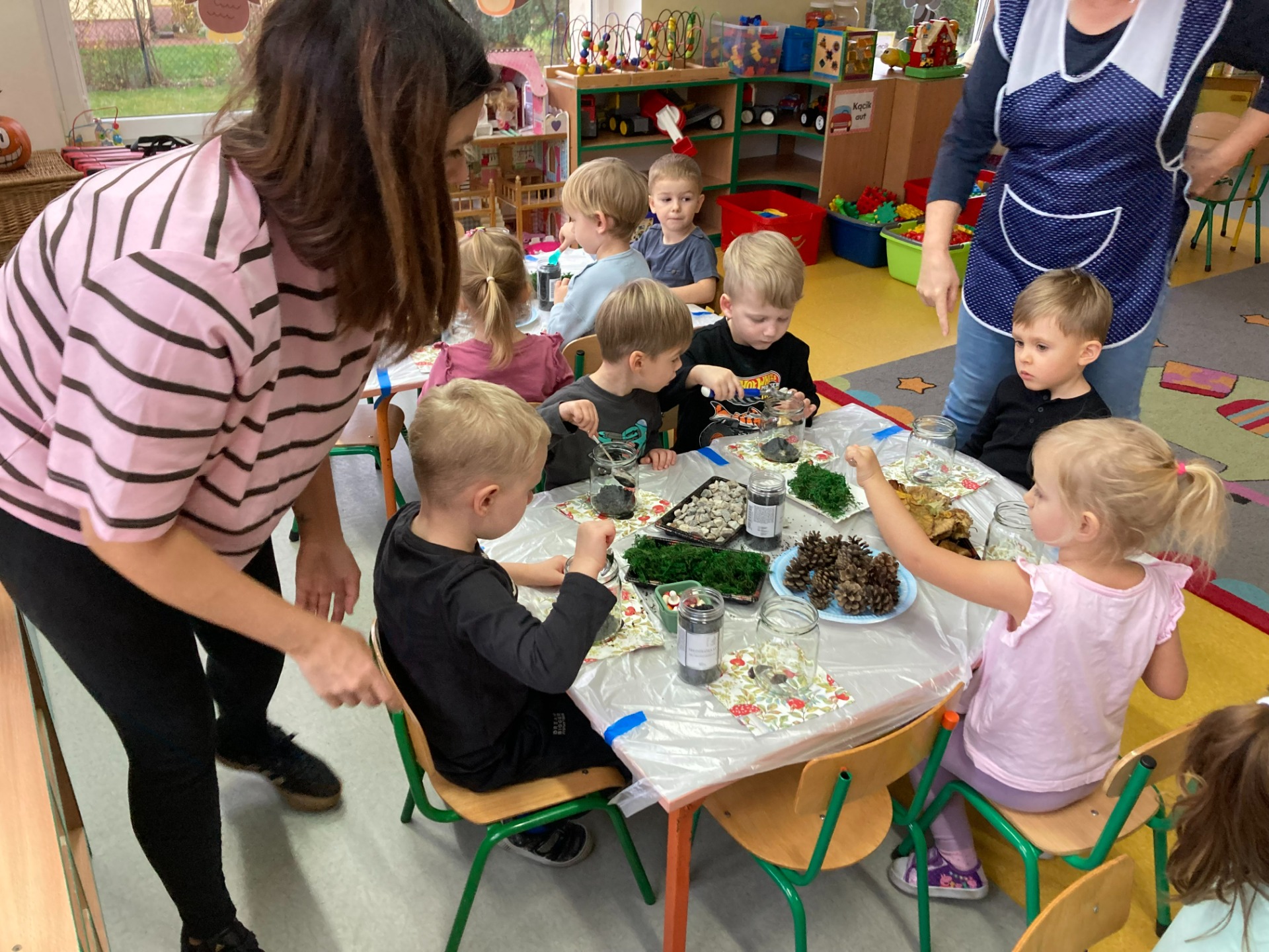 W grupie Pszczółki odbyły się wyjątkowe warsztaty pt.: „Jesień w słoiku”, podczas których dzieci miały okazję odkryć piękno jesiennej natury i stworzyć własne, małe kompozycje pełne kolorów tej pory roku. Zajęcia miały na celu rozbudzenie kreatywności, rozwijanie wrażliwości przyrodniczej oraz zachęcenie dzieci do obserwowania zmian zachodzących w otaczającym je środowisku. Podczas warsztatów przedszkolaki pracowały z naturalnymi materiałami, takimi jak: liście w różnych kolorach, szyszki, kasztany, żołędzie, patyczki, mech i suszone kwiaty. Każdy uczestnik otrzymał szklany słoik, do którego stopniowo układał wybrane elementy, tworząc wyjątkową jesienną kompozycję – mały „las w słoiku”.