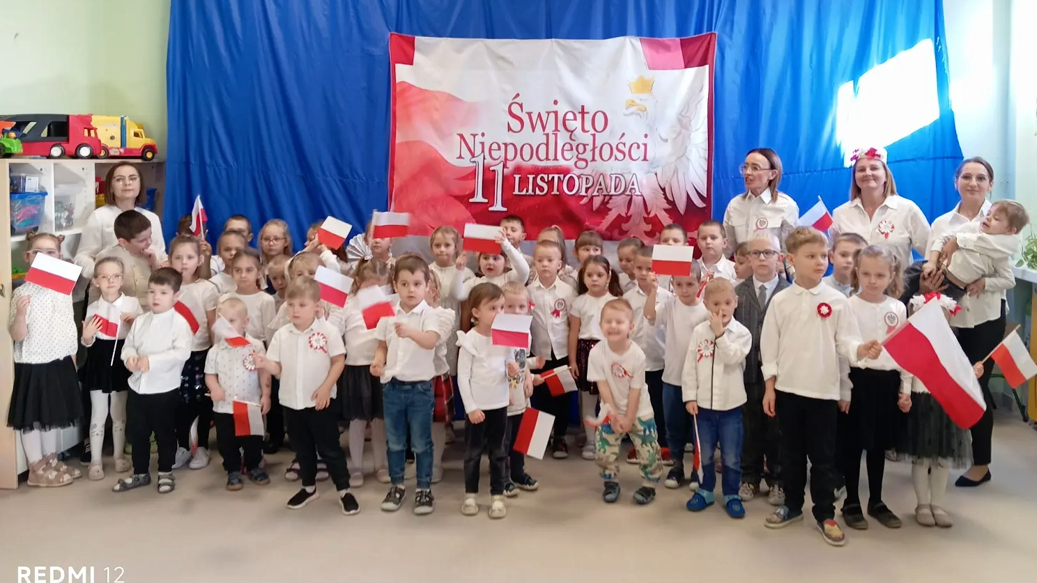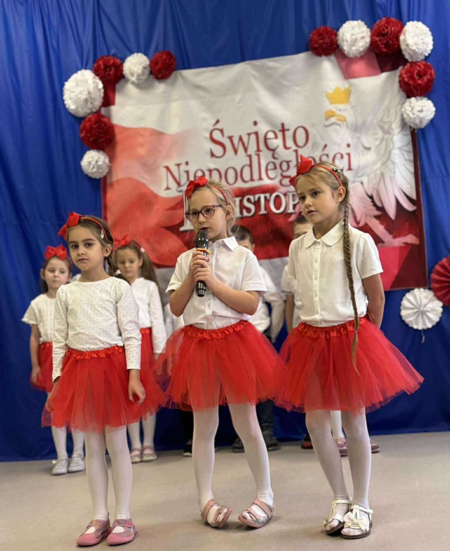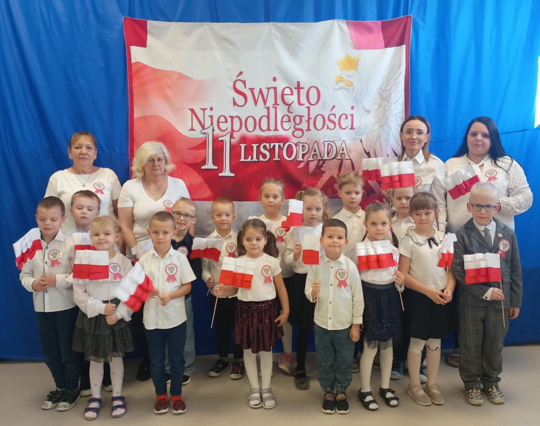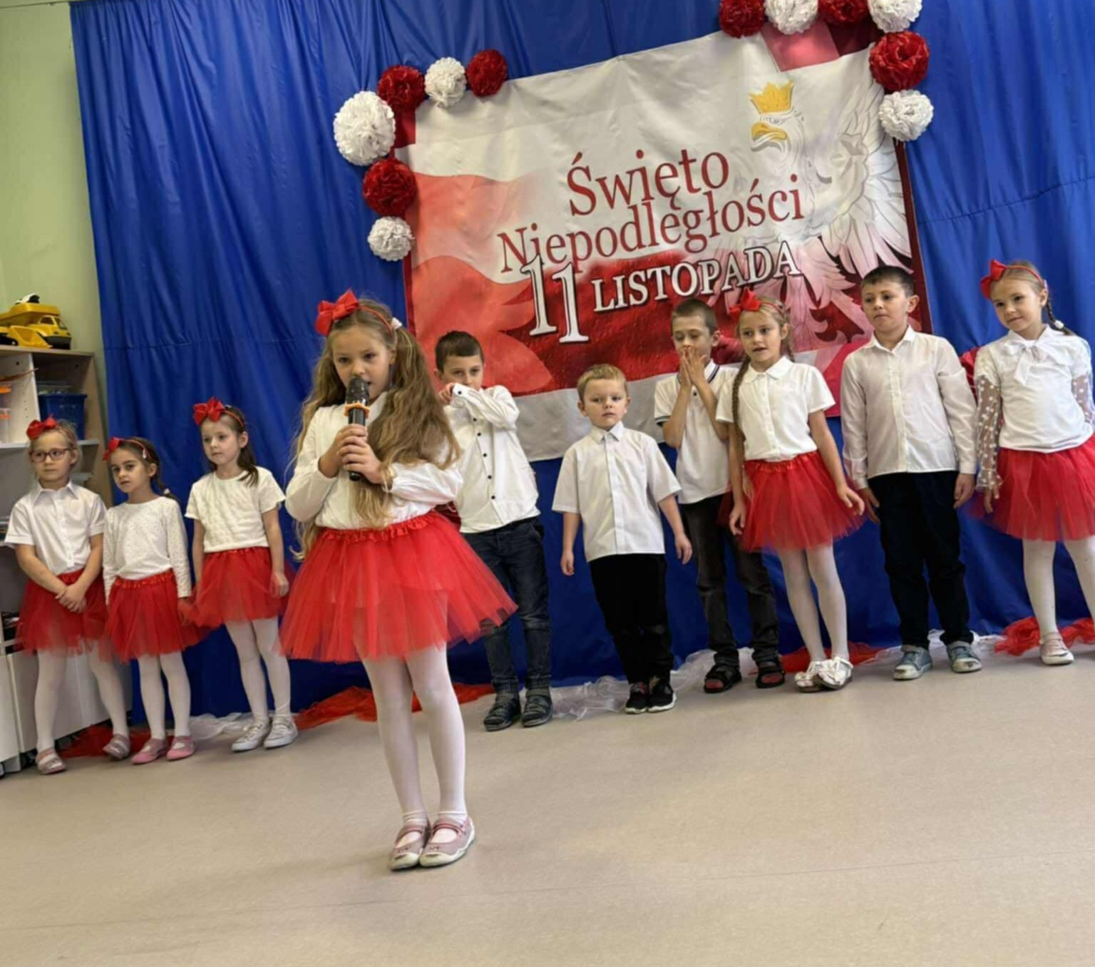 Tegoroczne obchody Święta Niepodległości rozpoczęły się uroczystym przedstawieniem przygotowanym przez dzieci z grup Tygryski i Gwiazdki. W programie artystycznym znalazły się wiersze, piosenki oraz scenki nawiązujące do historii naszego kraju. Mali artyści występowali z wielkim przejęciem i dumą, wzruszając zgromadzoną publiczność.