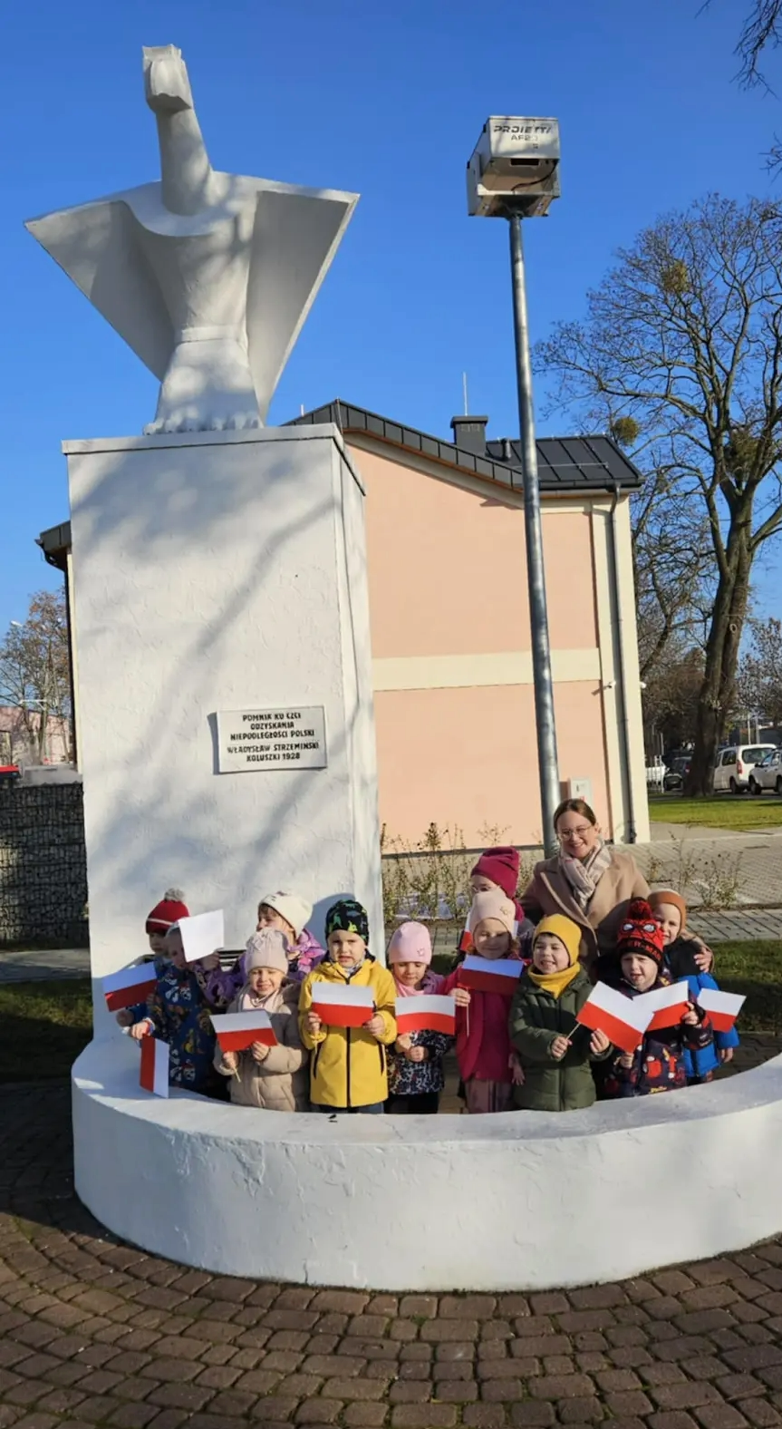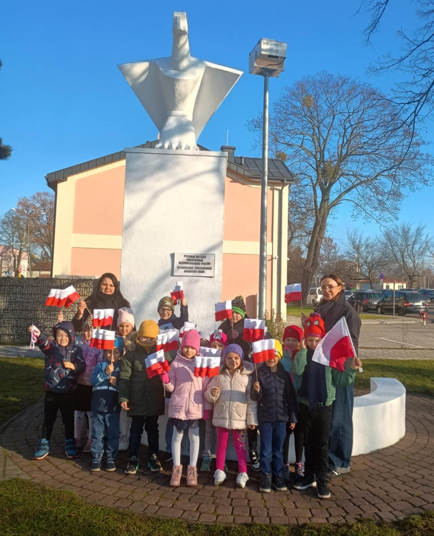 Nie zabrakło także wspólnego udziału w ogólnopolskiej akcji „Szkoła do hymnu”. 7 listopada o godzinie 11:11 cała społeczność przedszkola uroczyście odśpiewała Mazurek Dąbrowskiego. Była to wzruszająca chwila pełna dumy i jedności. Po hymnie grupy przedszkolne wraz z nauczycielami udały się pod pomnik Orła Białego, by oddać hołd bohaterom walczącym o wolność naszego kraju.
