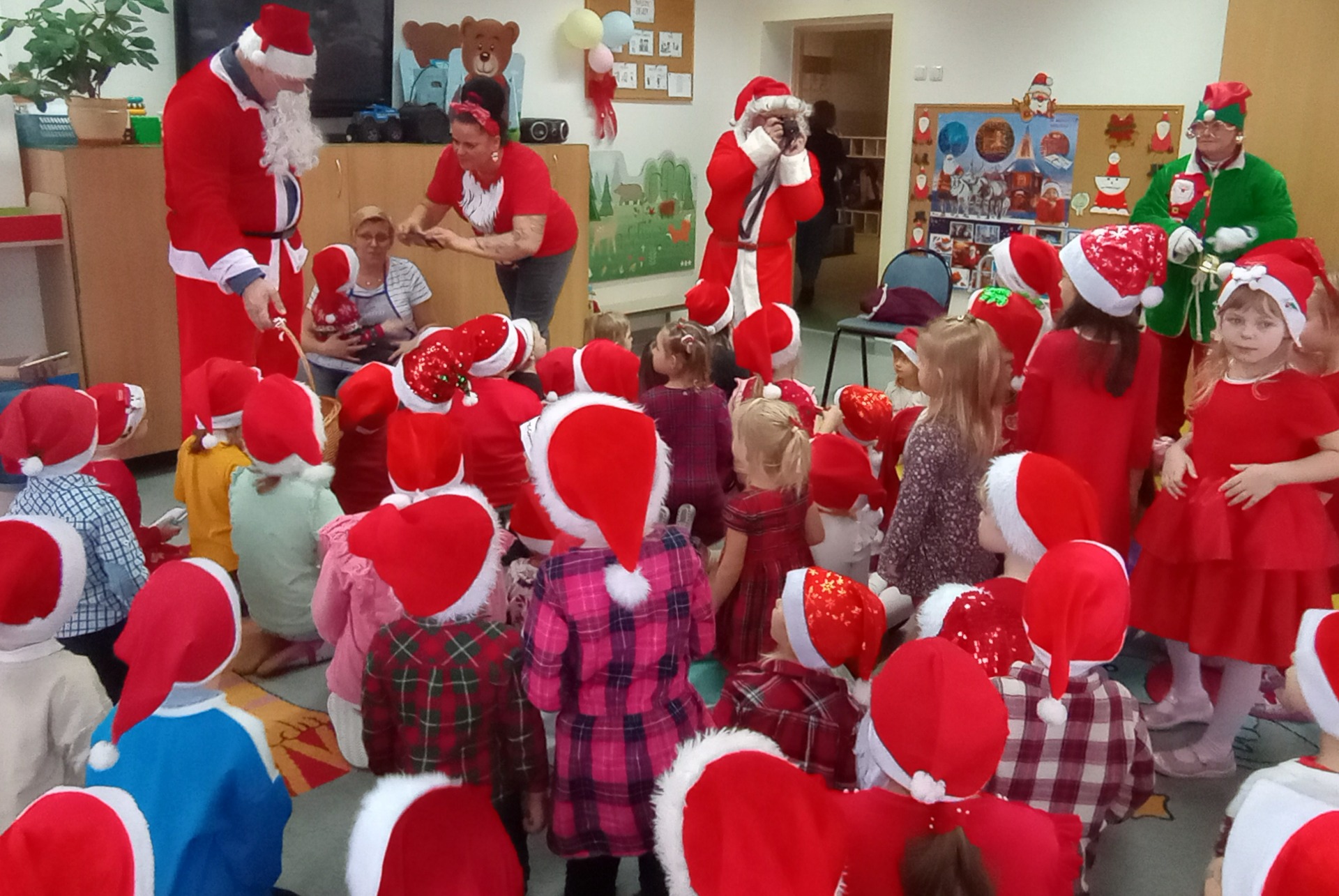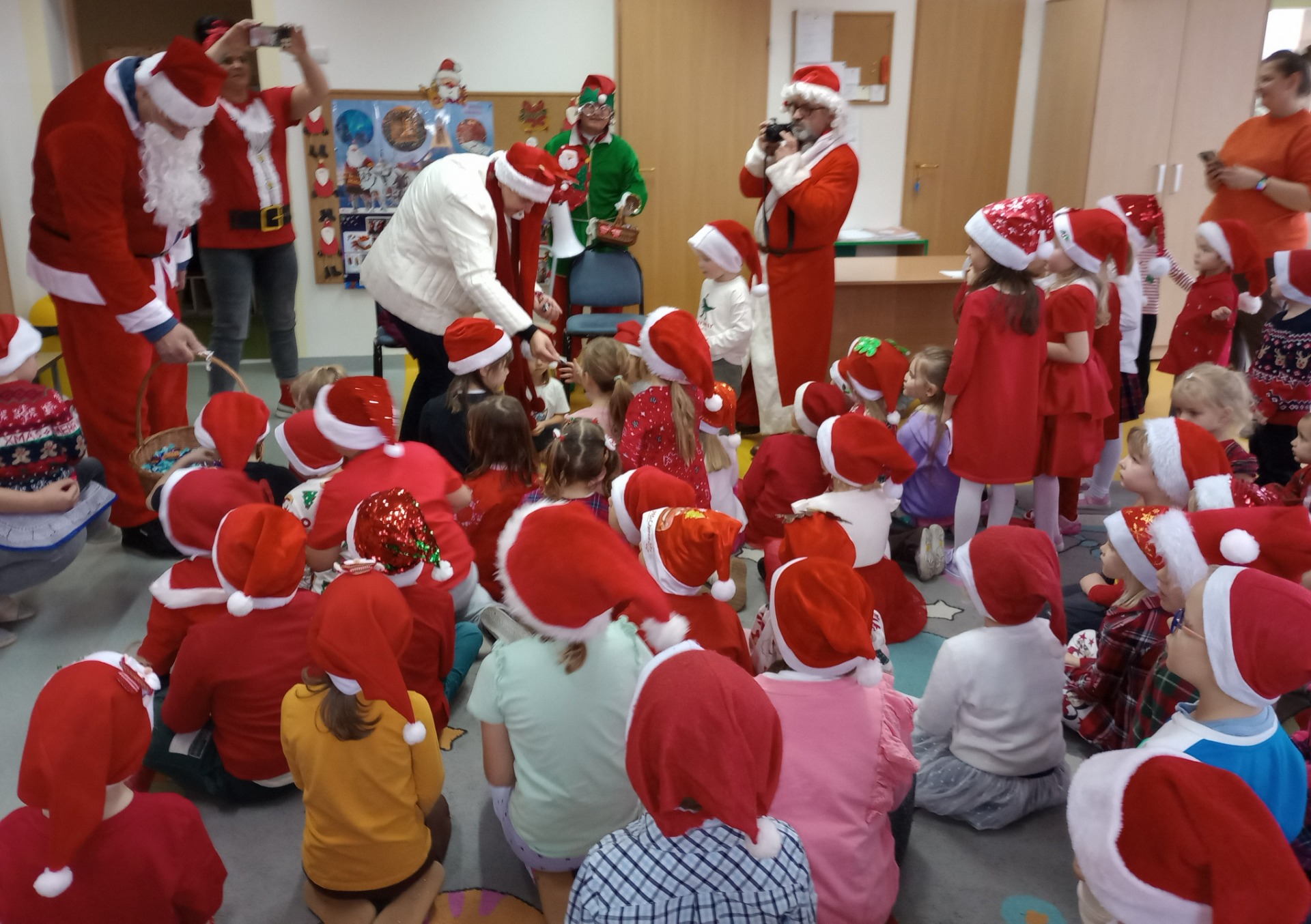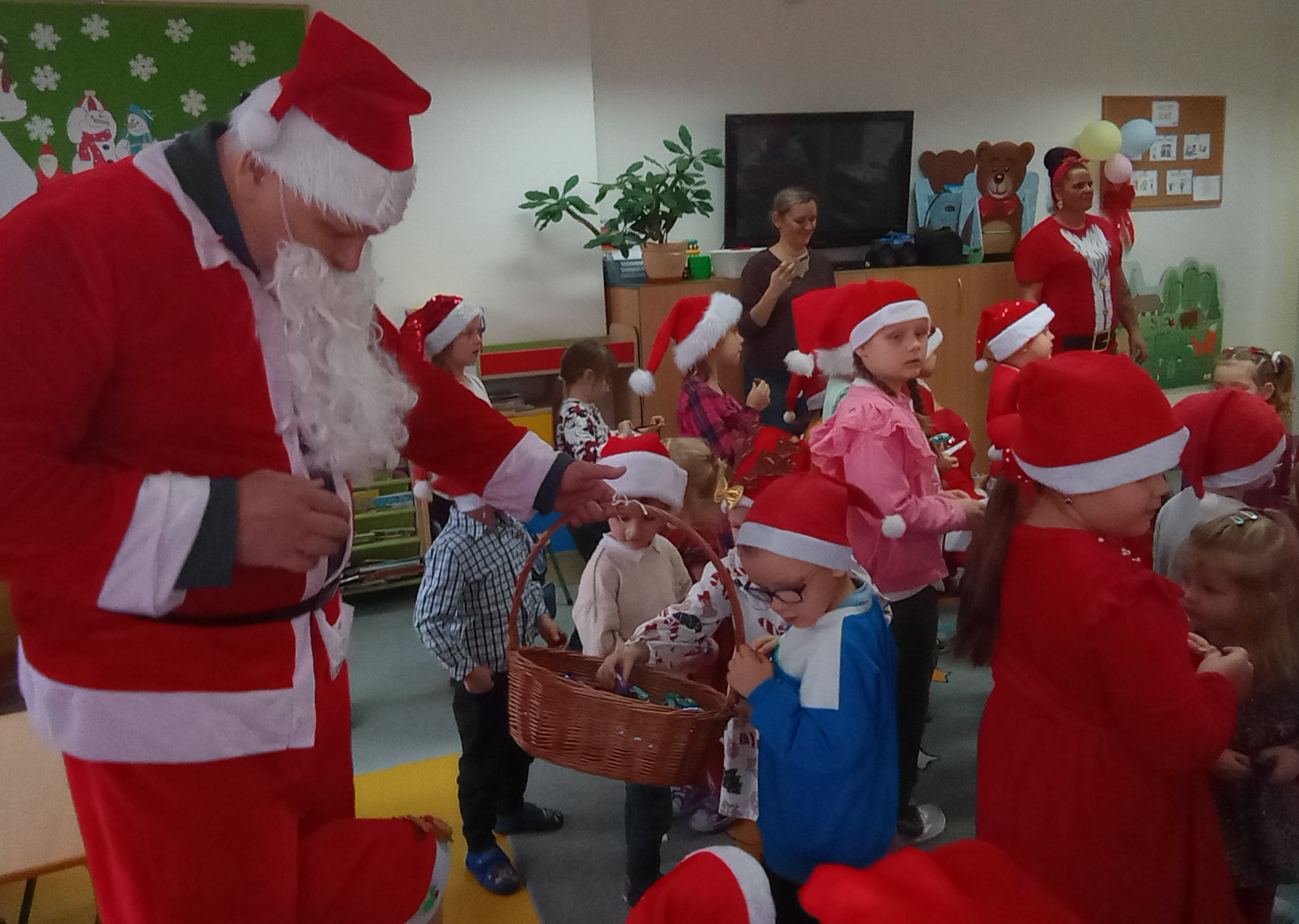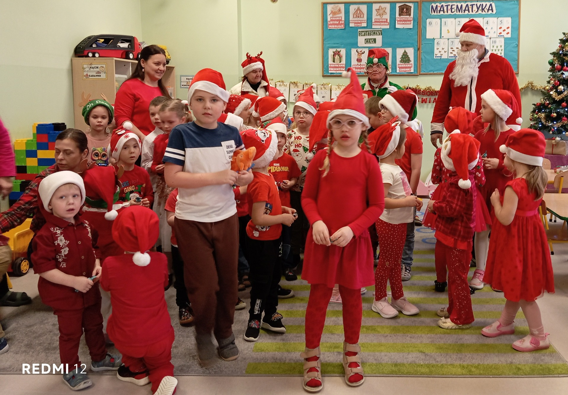 Dnia 5 grudnia w naszym przedszkolu odbyło się wyjątkowe, pełne świątecznej atmosfery spotkanie z orszakiem Świętego Mikołaja. Już od rana dzieci, ubrane w czerwone mikołajowe czapeczki, z podekscytowaniem i szerokimi uśmiechami wyglądały przez okna, wyczekując przybycia długo oczekiwanego gościa. Przedszkolaki przygotowały dla Mikołaja specjalne powitanie. Z ogromnym przejęciem zaśpiewały świąteczne piosenki oraz wypowiedziały wcześniej przygotowane życzenia, z radością dziękując za wizytę. W odpowiedzi Święty Mikołaj obdarował każde dziecko słodką niespodzianką.To wyjątkowe wydarzenie na długo pozostanie w pamięci wszystkich uczestników, wprowadzając nas w piękny, świąteczny nastrój i przypominając, jak ważne jest dzielenie się radością, dobrem i magią wspólnie spędzonych chwil.