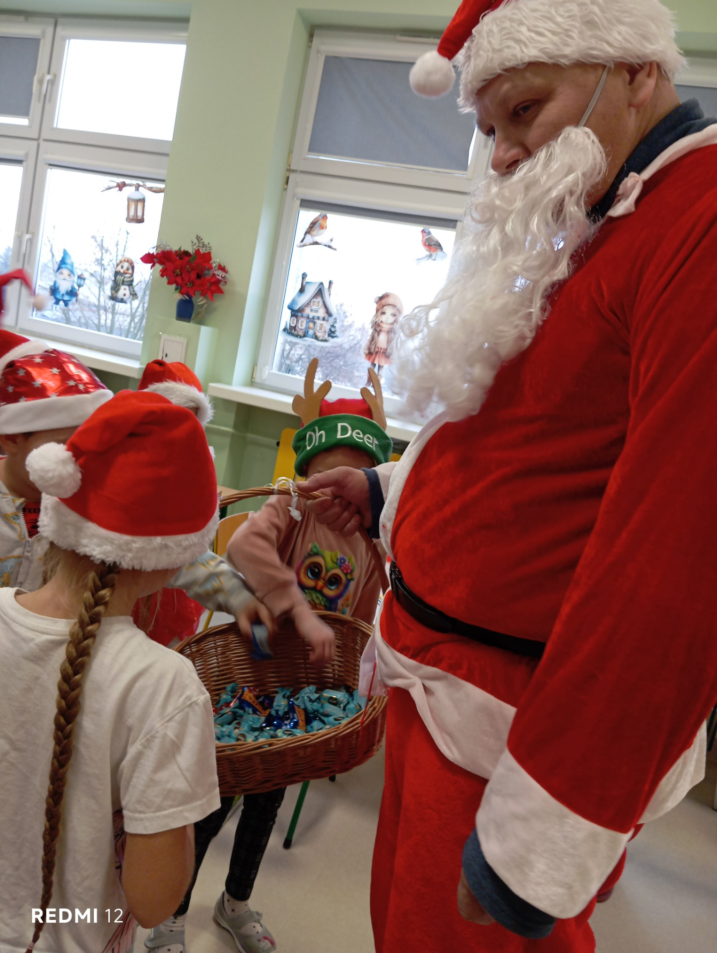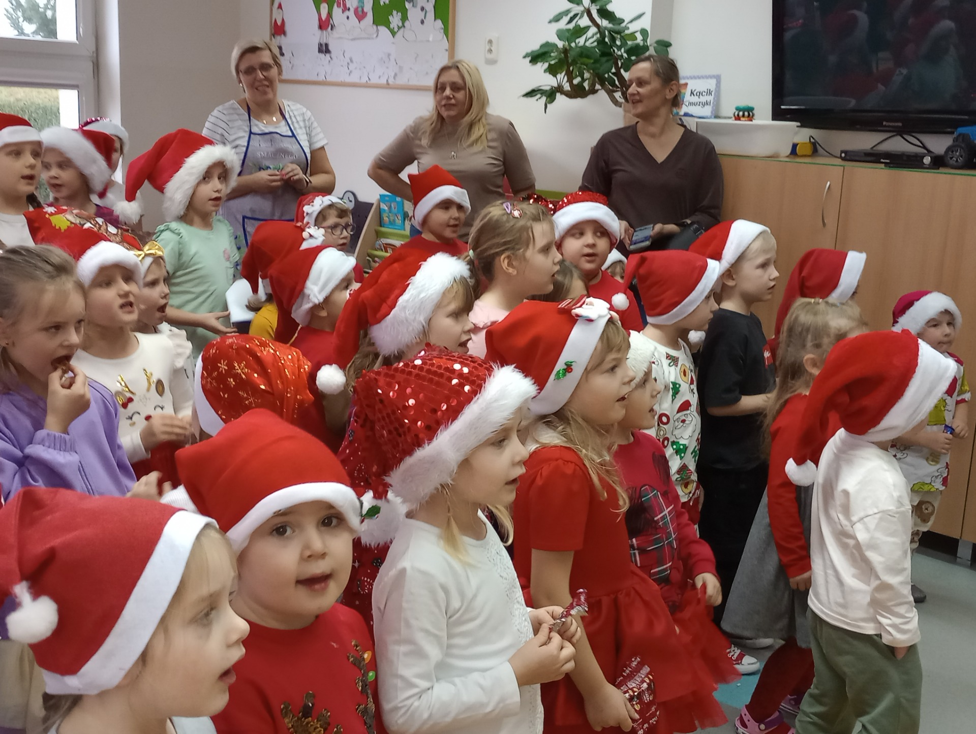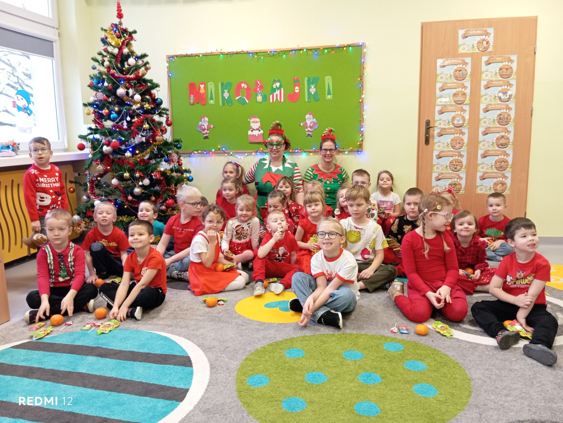 Dnia 5 grudnia w naszym przedszkolu odbyło się wyjątkowe, pełne świątecznej atmosfery spotkanie z orszakiem Świętego Mikołaja. Już od rana dzieci, ubrane w czerwone mikołajowe czapeczki, z podekscytowaniem i szerokimi uśmiechami wyglądały przez okna, wyczekując przybycia długo oczekiwanego gościa. Przedszkolaki przygotowały dla Mikołaja specjalne powitanie. Z ogromnym przejęciem zaśpiewały świąteczne piosenki oraz wypowiedziały wcześniej przygotowane życzenia, z radością dziękując za wizytę. W odpowiedzi Święty Mikołaj obdarował każde dziecko słodką niespodzianką.To wyjątkowe wydarzenie na długo pozostanie w pamięci wszystkich uczestników, wprowadzając nas w piękny, świąteczny nastrój i przypominając, jak ważne jest dzielenie się radością, dobrem i magią wspólnie spędzonych chwil.