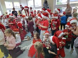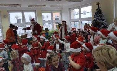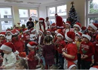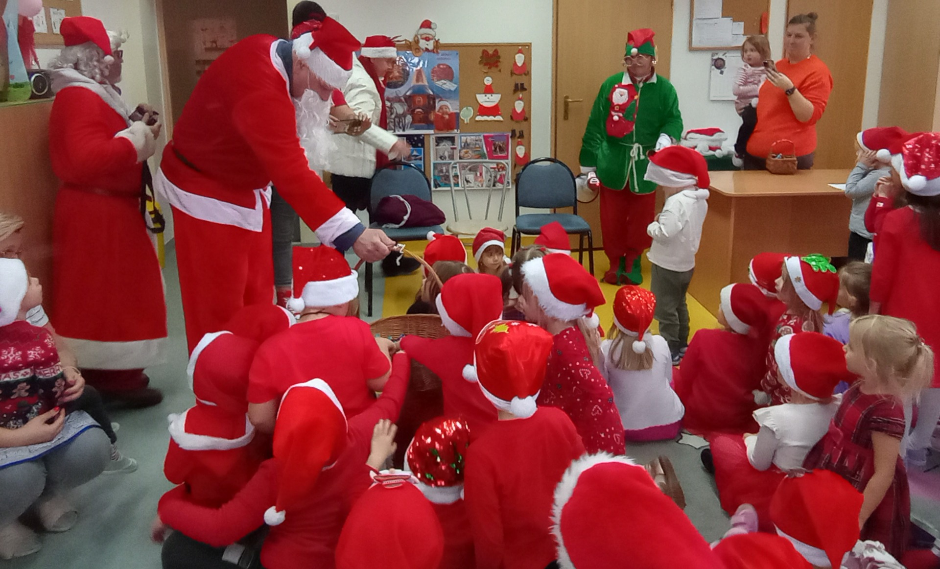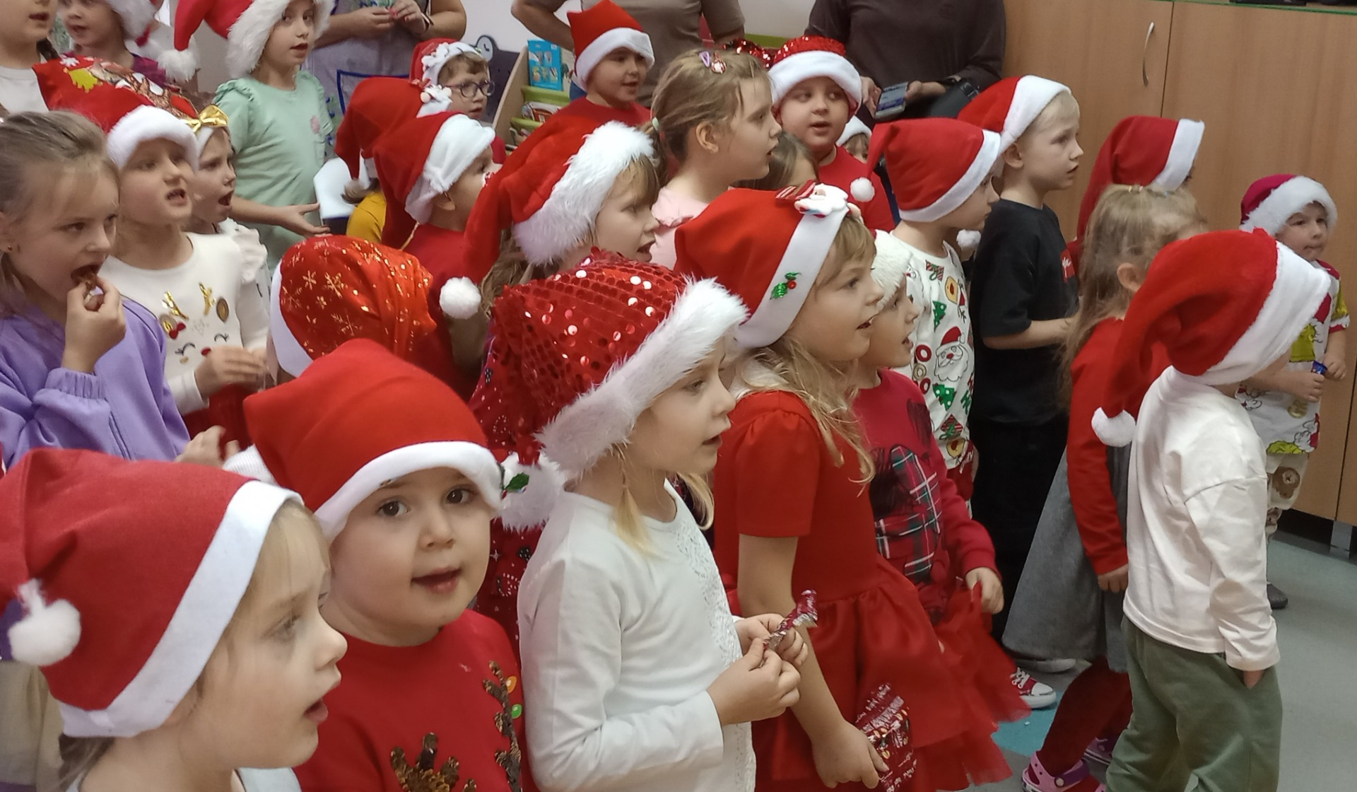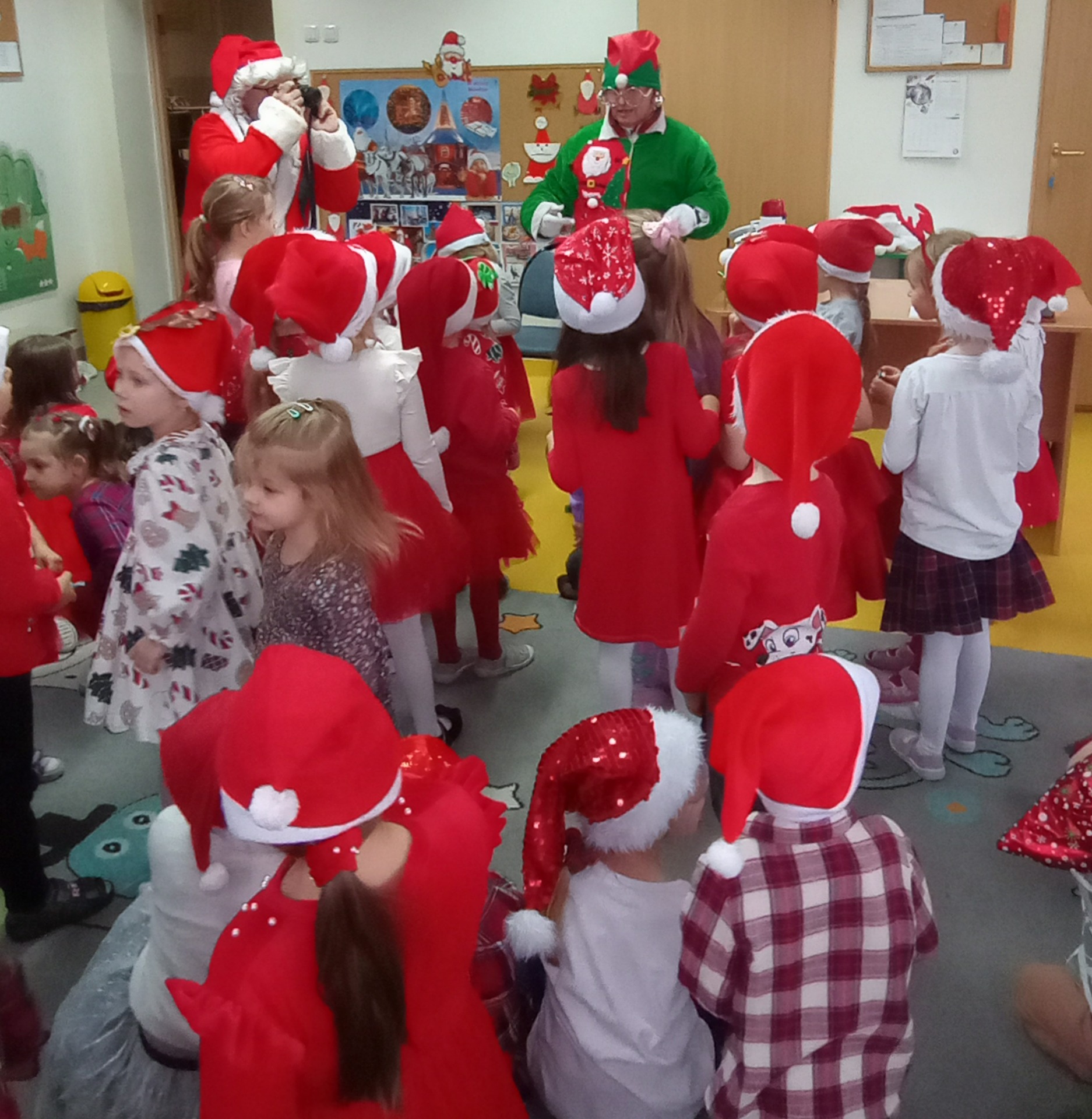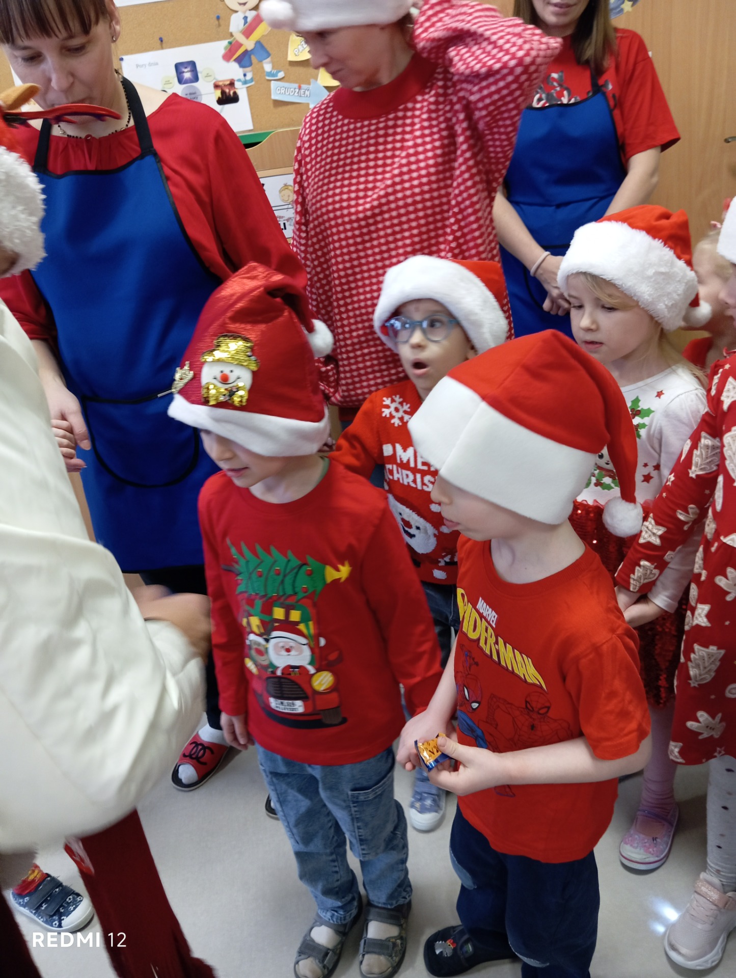 Dnia 5 grudnia w naszym przedszkolu odbyło się wyjątkowe, pełne świątecznej atmosfery spotkanie z orszakiem Świętego Mikołaja. Już od rana dzieci, ubrane w czerwone mikołajowe czapeczki, z podekscytowaniem i szerokimi uśmiechami wyglądały przez okna, wyczekując przybycia długo oczekiwanego gościa. Przedszkolaki przygotowały dla Mikołaja specjalne powitanie. Z ogromnym przejęciem zaśpiewały świąteczne piosenki oraz wypowiedziały wcześniej przygotowane życzenia, z radością dziękując za wizytę. W odpowiedzi Święty Mikołaj obdarował każde dziecko słodką niespodzianką.To wyjątkowe wydarzenie na długo pozostanie w pamięci wszystkich uczestników, wprowadzając nas w piękny, świąteczny nastrój i przypominając, jak ważne jest dzielenie się radością, dobrem i magią wspólnie spędzonych chwil.